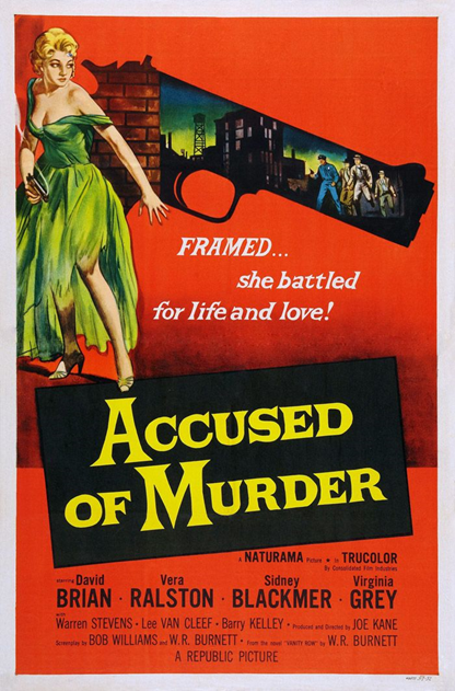 On pourrait dire que ce film doit être vu à cause de l’affiche qui est très originale, ou encore que ce film noir est tourné dans des conditions – faux cinémascope, dit Naturama, couleurs flamboyants, dites Trucolor – mais ce ne serait pas tout à fait juste. En effet c’est d’abord un excellent roman de W.R. Burnett qui est ici porté à l’écran. Et Burnett est pour nous un des piliers de ce système qui a fourni autant d’excellentes histoires. Auteur très prolifique, il a écrit des dizaines de romans, et participé à environ soixante-dix scénarios, et non des moindres, puisqu’il est à l’origine des films noirs d’avant la Seconde Guerre mondiale, dont The little Caesar de Mervyn Le Roy en 1931 avec Edward G. Robinson et le fameux Scarface d’Howard Hawks en 1932. Ses histoires de voyous doivent être considérées comme à l’origine du film noir. Ceux qui me suivent, savent que nous rencontrons son nom périodiquement. C’est le plus souvent intéressant, même si la qualité n’est pas toujours égale. Joe Kane, le réalisateur, était à l’origine un violoncelliste, puis il s’est reconverti dans le cinéma où on pouvait gagner un peu plus d’argent. Et il devint un réalisateur prolifique pour Republic Picture, avec qui il sera fidèle jusqu’à la fermeture de ce studio en 1959 où il avait eu la difficile charge de faire de Vera Ralston, l’épouse du patron de Republic, Herbert J. Yates, une grande star. Il dirigea bien plus qu’une centaine de films. Il travaillait très vite et proprement. Spécialisé dans les westerns, dont ceux avec John Wayne au début des années quarante, il avait commencé sa carrière du temps du muet. Il fera quelques incursions dans le film noir, il était aussi crédité très souvent en tant que producteur, il connaissait le cinéma dans les coins. A l’époque où Accused for murder est tourné, c’est déjà un vétéran qui a presque terminé sa très longue carrière qui s’achèvera difficilement en 1975.