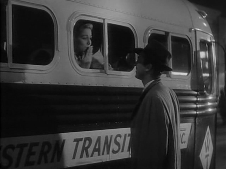 Les invraisemblances dans ce scénario sont légion, notamment ce final qui voit Radak attendre un long moment pour régler son compte à Steve, ou encore la passivité de Ferrari, mais peu importe. Cette histoire de couple en fuite va mettre en scène une rhétorique singulière qui va bien au-delà de la paranoïa engendrée par cette poursuite haletante. Le couple fuit aussi bien les gangsters que la police, c’est un thème connut au moins depuis The 39 steps d’Hitchcock en 1935. Ici, comme dans You only live once de Fritz Lang qui date de 1937[2], l’isolement du couple vis-à-vis d’un monde hostile est renforcé par le fait que la femme est enceinte et va avoir un enfant. L’histoire d’ailleurs emprunte beaucoup au film de Lang, notamment cette opposition entre la ville et la campagne, opposition qui est presque de tradition dans le film noir, surtout vers la fin des années quarante. Ici la campagne est vue comme une sorte de paradis perdu, le lieu qui a été abandonné dans sa simplicité quasi biblique pour les lumières de la ville et la consommation de produits frelatés. Lorsque les truands retrouvent la piste de Steve, ils sont comme des envahisseurs dans un lieu où du reste ils ne sont pas très à l’aise eux-mêmes. Malgré toutes les difficultés qu’il rencontre, Steve est honnête. La preuve ? Il va travailler avec les paysans, produisant quelque chose de ses mains, de même nous le voyons faire des heures supplémentaires avec son camion pour donner un peu de confort à sa petite famille. Le marchand de voitures d’occasion qui arnaque Steve, derrière ses manières d’honnête commerçant, n’est pas un travailleur, c’est une pièce rapportée dans cette campagne paisible, il tente de profiter des faiblesses de Steve pour le dépouiller, il est l’image de la fourberie. L’honnêteté se situe toujours au-delà des apparences. De même si pendant un moment on ne comprend pas Ferrari qui semble vouloir piéger Steve, la vérité sera révélée à la fin. Cependant si le film semble vanter les mérites de la famille comme refuge et comme symbole de la renaissance, il contient en creux une critique de ce modèle. En effet si Steve est vulnérable, c’est principalement parce qu’il est attaché à sa famille et qu’il est encombré d’un nouveau-né. Cet idéal familial auquel il doit se conformer demande des sacrifices importants. De même on verra le jeune couple être quasiment obligé de se marier religieusement pour faire plaisir à sa famille d’adoption. Même ce qui pourrait apparaître comme positif est marqué d’ambiguïté. Par exemple Steve sous prétexte de gagner cinquante dollars se débrouille finalement pour fuir la petite fête organisée par sa femme. On le sent d’ailleurs tout émoustillé par cette aventure d’une nuit. Il connaît Reynolds, et même si rien ne l’indique, le spectateur suppose qu’il sait que celui-ci fait partie d’un gang.
