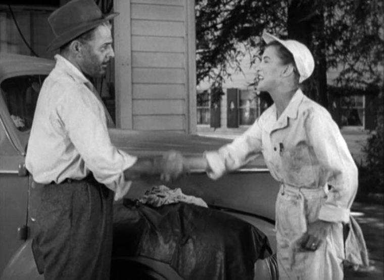 Le scénario contient quelques astuces bienvenues dont le revirement d’Irene prompte à accuser Walter d’assassinat n’est pas la moindre. Si cela n’apparait pas très original, c’est, en tous les cas, bien ficelé. Mais sous les dehors d’une simple histoire de meurtre d’un couple adultérin, il y a bien plus de profondeur qu’on ne le pense. D’abord il n’y a pas un trio, mais deux, le premier est formé d’Irene, Walter et Torrence, et le second d’Irene, Walter et Marsha. Ce qui veut dire que les deux femmes sont celles qui conduisent le récit et qui vont se livrer à une lutte à mort. Ce n’est pas pour rien que c’est Marsha qui joue un rôle déterminant dans l’apport des preuves qui vont faire libérer Walter et mettre Irene à l’ombre. Walter est passif, il attend que les évènements décident pour lui. Marsha porte le pantalon, on le voit tout de suite, dès la première rencontre avec Walter, elle dirige une station-service dans une salopette de pompiste, symbole de la virilité, tandis que son futur mécano est encore complètement hébété. D’ailleurs en jouant auprès de sa femme qui le cocufie allègrement, il a l’air d’un imbécile dévirilisé dans cette manière de minauder en lui offrant des fleurs ou des bijoux, comme s’il voulait à tout prix attirer ses faveurs par des cadeaux disproportionnés. Irene se moque de Walter, mais elle dirige aussi le niaiseux Torrence qui est manifestement une autre marionnette et qui fait ce qu’elle décide. Si le but d’Irene est de se débarrasser d’un mari encombrant pour lui piquer son fric et aller vivre avec son amant, celui de Marsha est de se débarrasser d’Irene pour récupérer un mari riche et prévenant qui remplacera celui qui est mort à la guerre.