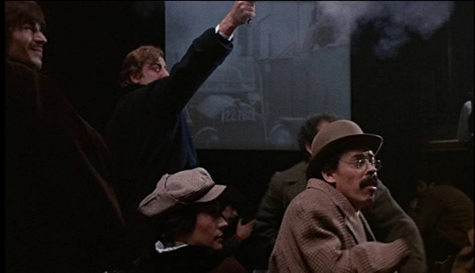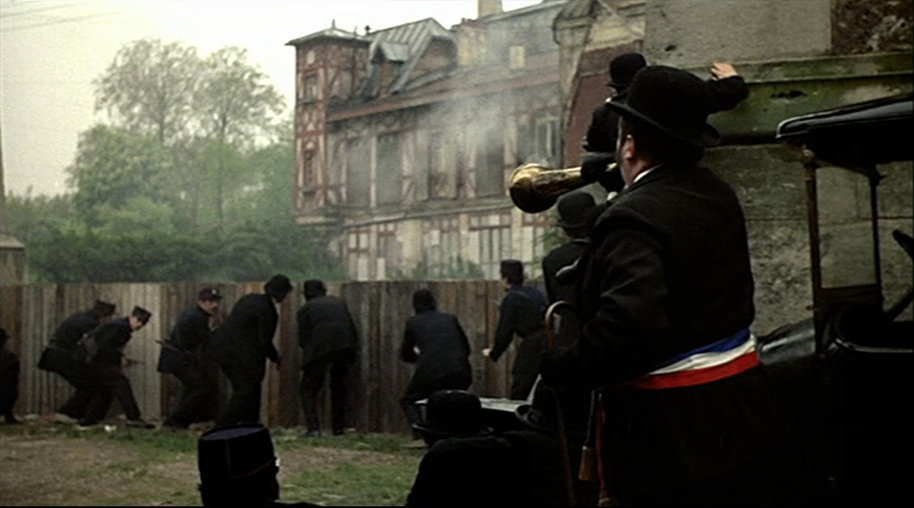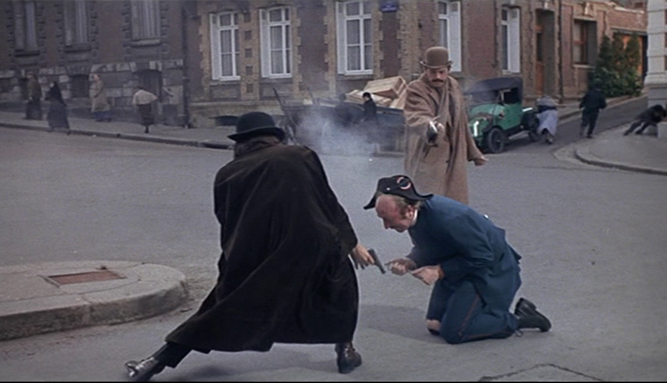 La mise en scène est plus compliquée qu’on ne pense parce qu’il faut à la fois saisir la dérive sanglante des anarchistes, et l’enquête de la police. C’est assez bien équilibré de ce point de vue. Rapidement on comprend que la machine policière est en route, et que les anarchistes n’ont aucune chance de triompher. Les scènes d’action se multiplient. Les braquages de la bande à Bonnot sont particulièrement bien filmés. Fourastié a fait des progrès depuis Un choix d’assassins. L’attaque de la rue Ordener et le moment où Bonnot fait arrêter une automobile pour la voler, puis quand les anarchistes assassinent le propriétaire du véhicule, sont deux scènes remarquables qui saisissent aussi bien la profondeur de champ que le mouvement en choisissant des angles de prises de vue légèrement plongeant. Ça donne une dimension spatiale qui se marie très bien avec les décors. J’aime beaucoup la séance de cinéma qui aurait pu être fatale à la bande. D’abord parce qu’elle représente un film dans le film, et dans cette mise en abime, il y a bien sûr une interrogation sur ce que montre réellement un film. Mais cette scène voit les policiers plutôt nombreux investir le café où le film est projeté, et là Bonnot déclenche la panique, en tirant de bas en haut, façon Horde sauvage. Le montage est très serré, ce qui accroît un peu plus la vitesse. Fourastié est resté tout de même sobre dans la mise en scène de l’assaut contre la maison de Choisy-le-Roy.