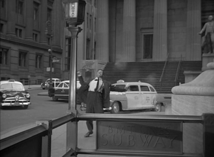 De ces principes scénaristiques va découler la mise en scène proprement dite. On a déjà souligné très souvent que ce film avait été un des premiers à utiliser les décors naturels de la ville de New York. En ce sens il est dans la lignée de The naked city de Jules Dassin[5]. Mais à mon sens il va un peu plus loin dans l’utilisation de la verticalité de la ville. Les immeubles sont écrasants, et Joe Norson lève souvent les yeux en l’air comme s’il voulait par la pensée au moins échapper à cet écrasement. Dès l’ouverture, un survol en hélicoptère nous montre la ville hérissée de gratte-ciel. On verra encore à la fin la poursuite de Garsell par la police depuis une vue plongeant par-dessus les immenses tours, ce qui donne à la fois l’idée d’un précipice et celle d’un labyrinthe, voire d’une prison dont on ne peut s’extraire. La photo est somptueuse, il faut dire que dans le début des années cinquante New York est très photogénique. Cette fois Anthony Mann ne s’est pas assuré l’aide de John Alton, mais c’est Joseph Ruttenberg qui s’y est collé. Certes il est plus discret qu’Alton dans le jeu des ombres et des lumières, mais c’est un très grand photographe qui obtiendra l’Oscar de la meilleure photographie quatre fois, notamment pour Somebody Up There Likes Me de Robert Wise en 1956, film qui se passe aussi dans New York. Formellement Anthony Mann est beaucoup à l’aise ici que dans le désert de Border incident. Cependant comme très souvent il manque un peu d’équilibre entre les parties. Par exemple on ne comprend pas très bien pourquoi Joe abandonne sa femme sur le point d’accoucher et se réfugie dans un hôtel. Que fuit-il ? La réponse est peut-être dans le pont de Brooklyn omniprésent dans le film qui suggère un passage vers l’âge adulte et l’abandon des chimères. Le film va s’animer après que Joe se soit retrouvé au bord de l’Hudson en train de méditer sur sa destinée. Le dernier tiers est bien meilleur que tout le reste, on avance, passant de la boîte de nuit aux docks de New York.