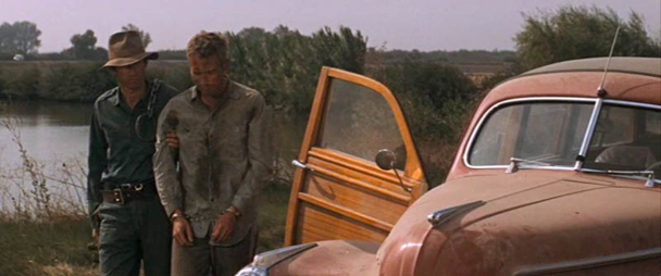 Evidemment ce film possède aussi de belles qualités cinématographiques. Ce réalisateur discret avait auparavant mis en scène l’excellent Muder, inc.[2]. Tourné en Panavision, Rosenberg utilise au mieux les décors naturels. C’est sensé se passer en Floride, il y fait donc chaud et les fossés sont remplis de serpents. La belle photographie de Conrad Hall saisi parfaitement cet espace particulier, aussi bien dans sa profondeur de champ que dans ses couleurs et donc sa lumière. Au-delà des formes géométriques que Rosenberg développe, le cadre est parfait, il y a aussi de très beaux mouvements de caméra, dans la construction de la route, ou dans les discours verbeux été dérisoires du Captain. Le long défilé des camions à l’aube, la paisibilité des chants des bagnards dans leurs rares heures de repos sont filmés dans des plans d’ensemble qui donnent beaucoup de vie à l’histoire. Il y a également pas mal de science dans le parcours que fait la caméra en traversant à plusieurs reprises le dortoir des prisonniers.