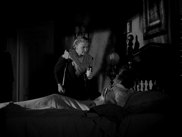 Evidemment, si on s’en tient au fil de l’intrigue, ça ne tient pas debout, jusqu’à cette fin maladroite. Mais le film est intéressant à la fois par sa thématique et par sa mise en scène. Tout d’abord, il y a le portrait d’un homme faible et passif – Johnny – traumatisé par la guerre, il n’est plus bon à rien et se raccroche à des rêves. En effet dans un premier temps il tente de se convaincre qu’il est amoureux de Rosemary, mais Leslie va lui faire comprendre sans rien dire la différence qu’il y a entre le fantasme et la réalité. Johnny est donc face à une femme forte. On comprend que ce thème ressort du changement de la place des femmes dans la société américaine pendant le conflit : les hommes étant sur le front, il a fallu que les femmes prennent en charge la vie courante. Tandis que les hommes se sont affaiblis, les femmes se sont émancipées. Le fait que Leslie soit un médecin – profession très bien considérée et nécessitant un haut degré d’instruction – est un signe qui ne trompe pas, alors que Johnny ne sait pas de quoi sera fait son avenir professionnel. Johnny n’est pas très pratique, d’ailleurs quand il y a l’accident de train, c’est Leslie qui prend les initiatives et lui reste complétement passif. Le second aspect est le caractère d’Hilda. Elle a en effet échoué sa vie, même si elle est très riche : elle n’a jamais eu d’enfant. Elle s’est donc construit dans sa tête une famille imaginaire pour compenser ce manque. Stérile, elle ne sert à rien, et c’est bien cela qui la pousse à faire le mal : cette rage de voir qu’aucun de ses désirs profonds ne peut s’acheter. C’est une psychopathe qui n’hésite pas à tuer. Le film est d’ailleurs placé sous le signe de la folie : Johnny n’en est pas loin, Hilda y est complétement plongé, et Ivy suit de très près cet effondrement général. La maison d’Hilda perchée sur la colline au-dessus de la mer, représente cette réalité qui s’est abstraite du monde, qui s’est retranchée de la vie réelle. Quand Hilda vient chercher Johnny dans cette vaste maison, c’est aussi pour le ramener sur terre. Cette thématique qu’on pouvait déjà voir dans Rebecca d’Hitchcock, Philip McDonald la reprendra pour The dark past de Rudolph Maté. On y trouvera un autre psychopathe auquel un médecin tente de venir au secours pour le sauver de la folie[1]. Il y a ici une recherche des raisons qui motivent le criminel qui est typique du film noir de la première moitié des années 40.