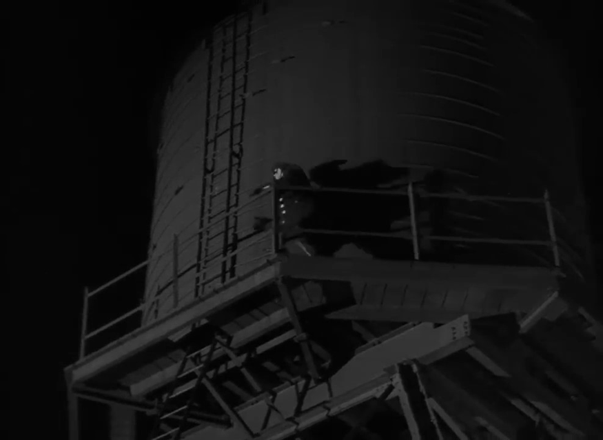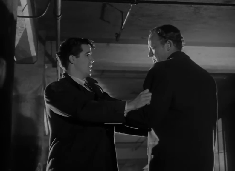 Il y a deux histoires emboitées, celle de John Kelly et de ses états d’âme qui risquent de le mener à la criminalité et puis celle de Hayes Stewart et de son employeur avec qui il est en guerre. Il va y avoir plusieurs moments de bravoure, d’abord le cambriolage des bureaux de Biddel. C’est longuement filmé, Auer prend le temps de détailler les angoisses de Stewart qui a du mal à débloquer l’ouverture. Il est sous pression, ses mains sont moites, parce qu’en même temps les policiers inspectent l’immeuble, et il le sait. A ce moment-là la rencontre inévitable entre John et Stewart aurait pu avoir lieu, mais elle va être délayée. Le deuxième moment c’est la poursuite finale. Remarquablement filmée, elle dure très longtemps, avec de très beaux travellings, mais aussi une belle façon de filmer la poursuite sur le réservoir de gaz, manière dont s’emparera Robert Wise pour Odds Against Tomorrow[1]. Entre John et Stewart, c’est comme une sorte de dialogue et les deux hommes cherchent à se rejoindre, mais ils n’y arriveront pas. Au fond ils se ressemblent un peu.